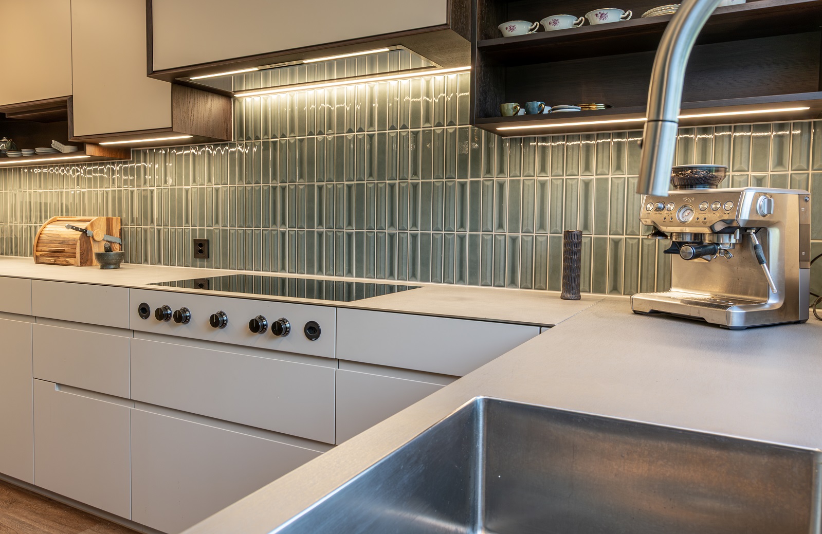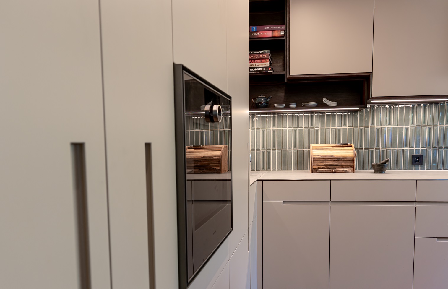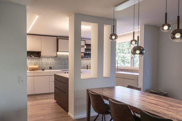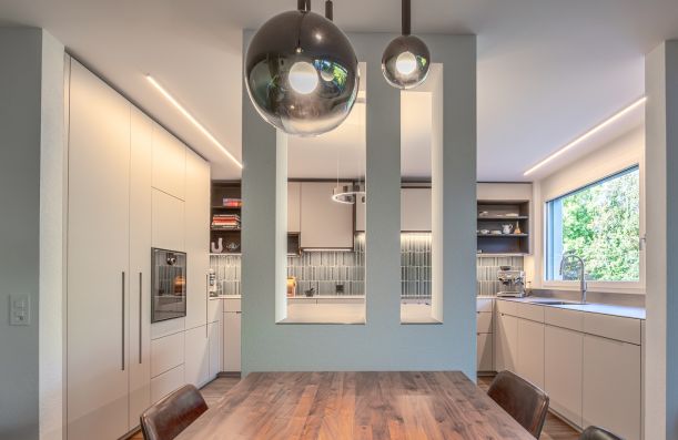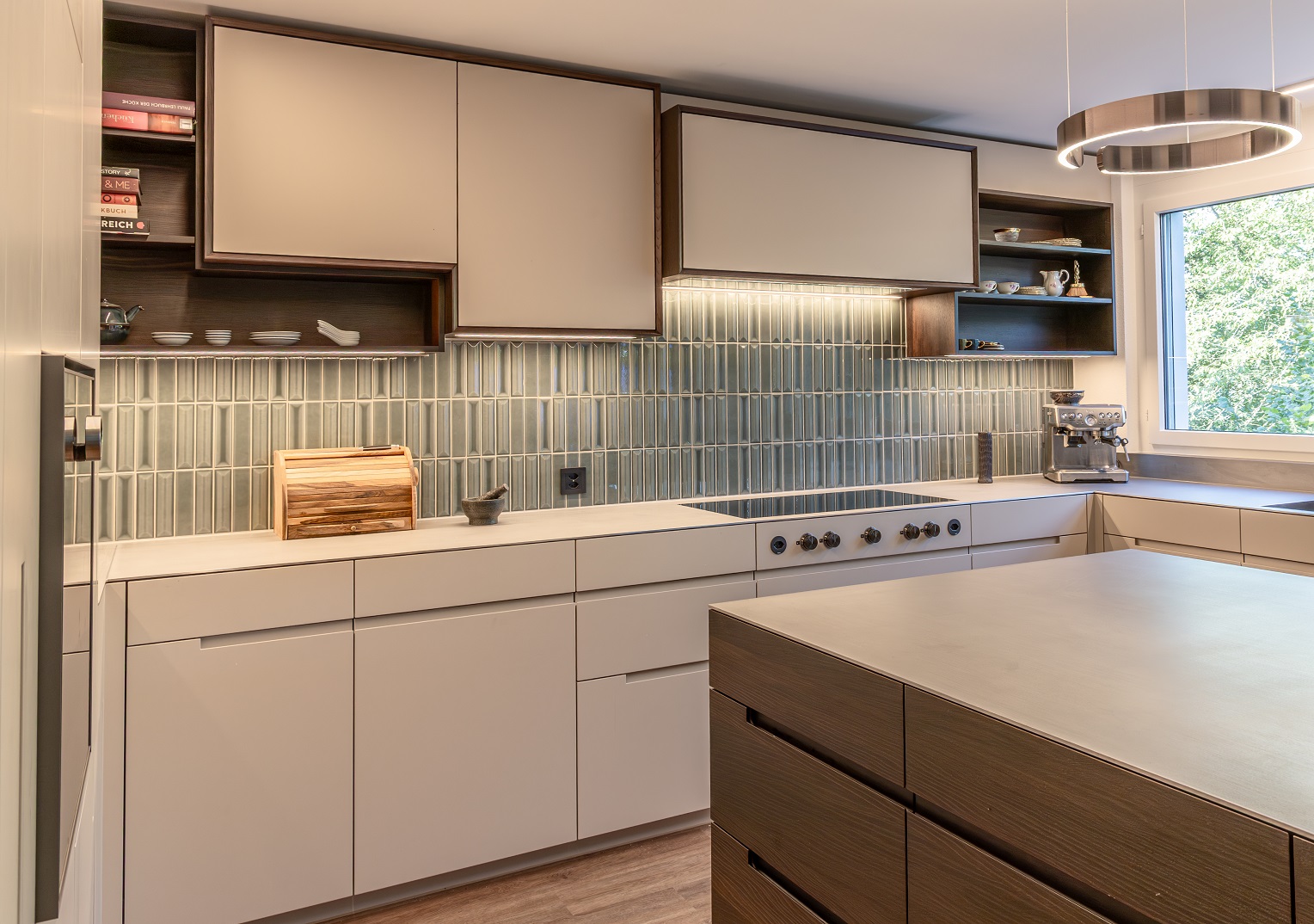 Die zentral platzierte Kücheninsel bildet das Herzstück des Raumes und schafft grosszügigen Platz für die ganze Familie. Durch die Umwandlung der ehemals geschlossenen Küche in ein offenes Konzept konnte der Raum deutlich vergrössert und zusätzlicher Stauraum gewonnen werden. Die U-Form ermöglicht komfortables Arbeiten für mehrere Köche gleichzeitig, während integrierte Säulen die statischen Anforderungen elegant aufnehmen. Eine raffinierte Mischung aus geschlossenen und offenen Schränken in unterschiedlichen Grössen verleiht dem Design Tiefe und Individualität. Akzente setzen die Rückwand handglasierten Keramikplatten sowie hochwertige Geräte wie der Gaggenau Backofen und das übergrosse Kochfeld, die Funktionalität und Exklusivität vereinen.